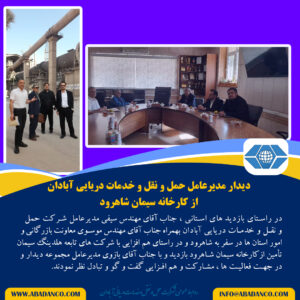 دیدار مدیرعامل شرکت حمل و نقل و خدمات دریایی آبادان از کارخانه سیمان شاهرود 7 آبان ارسال شده توسط اکبر جاهدپور دسته بندی: اخبار بدون دیدگاه دیدگاهتان را بنویسید لغو پاسخ ارسال نظر Δ